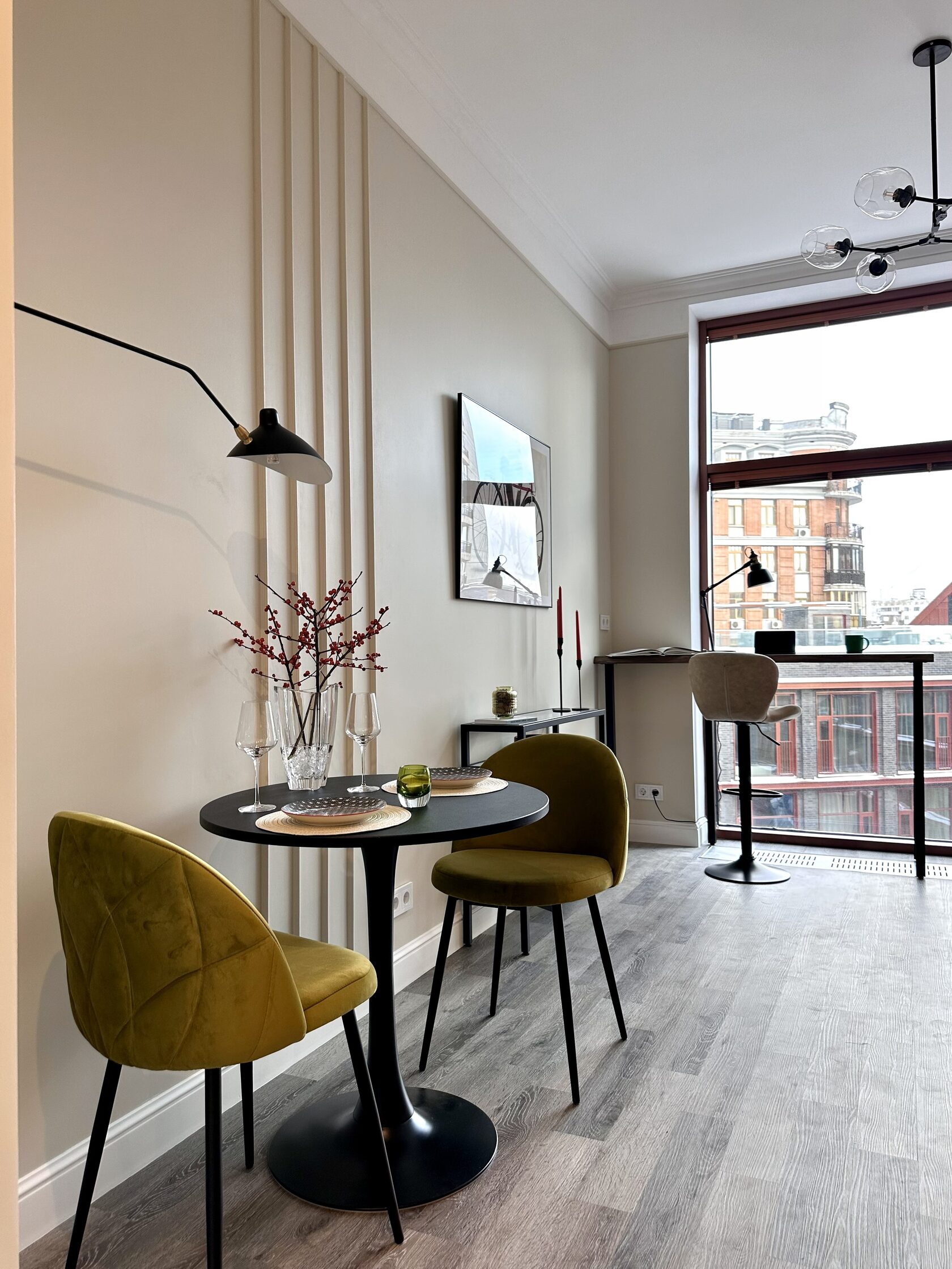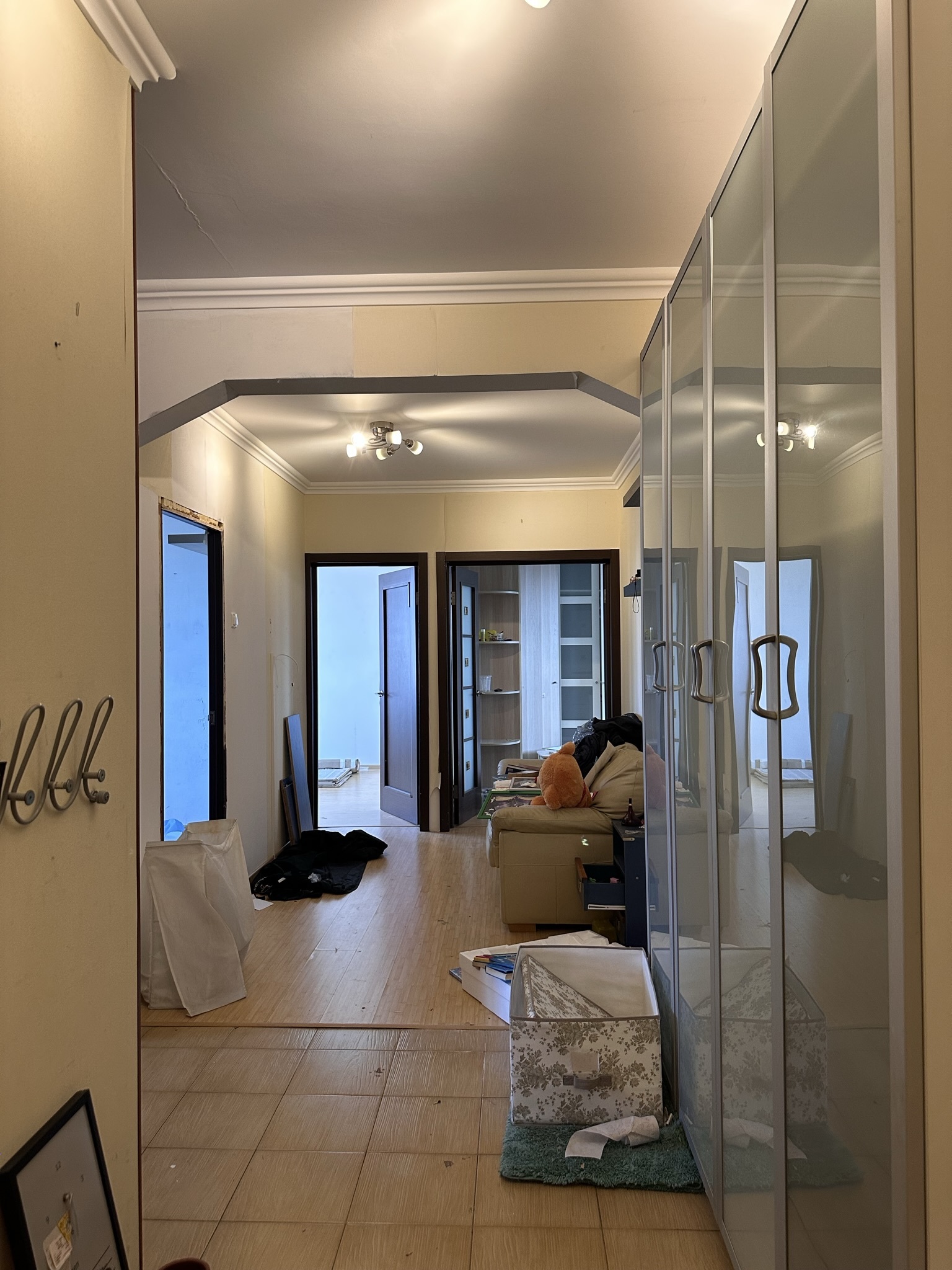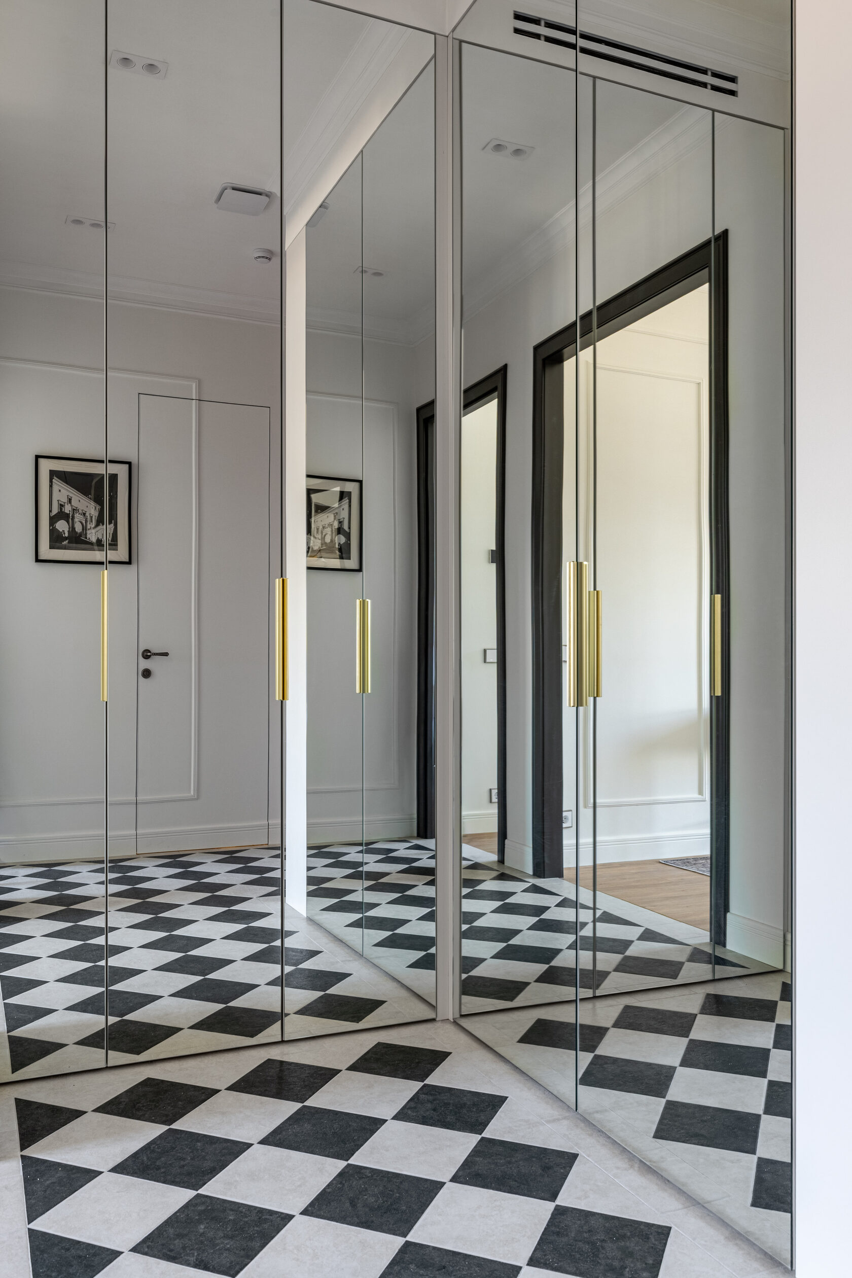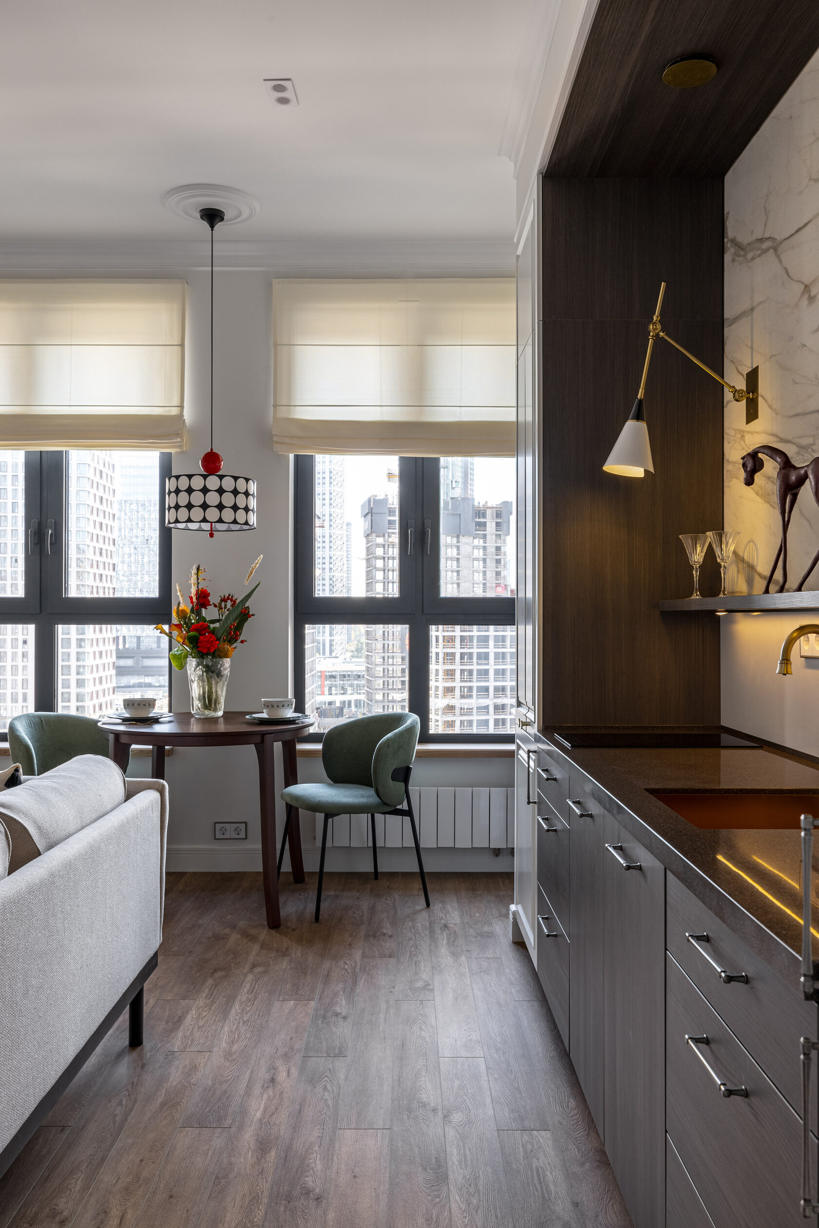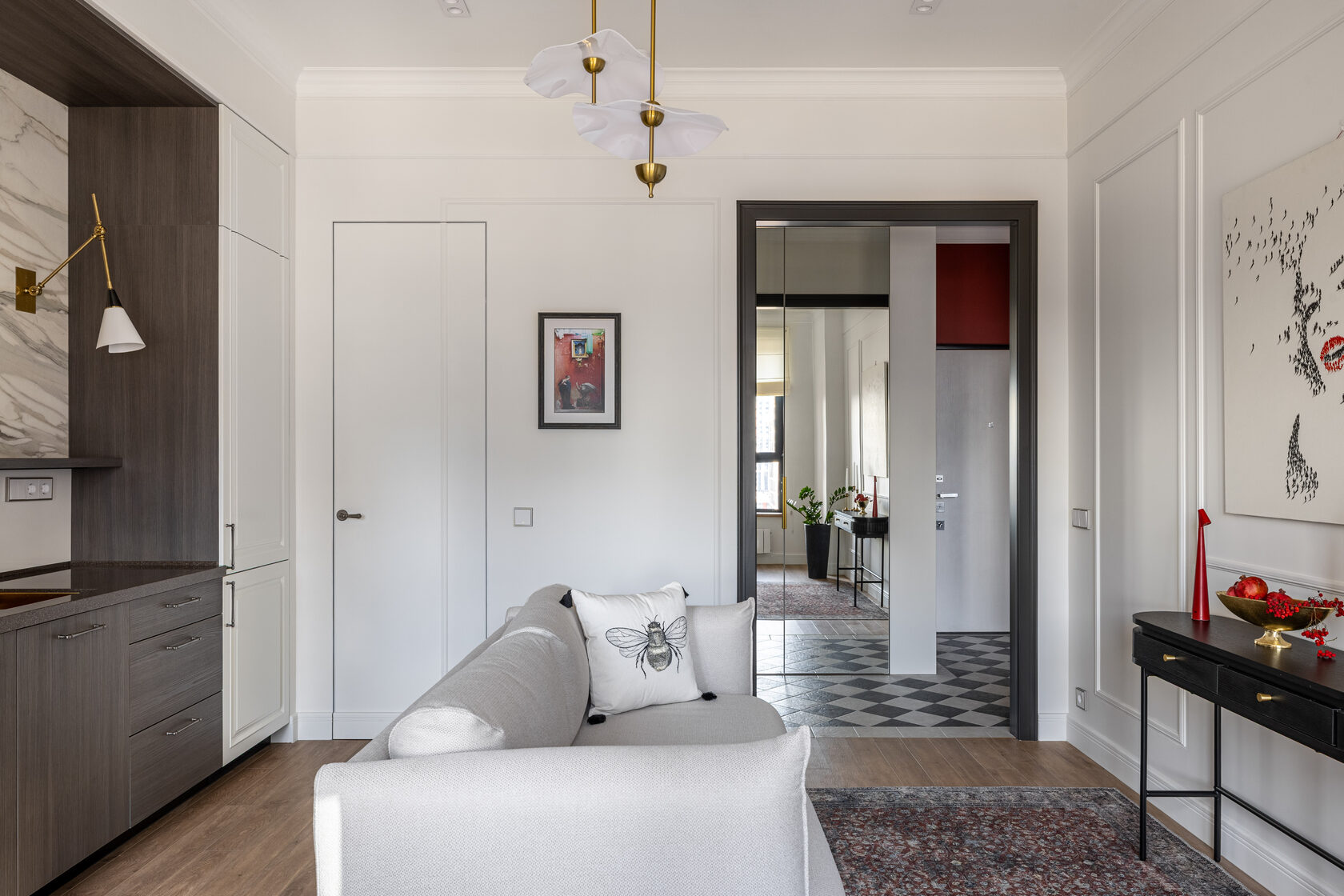 Квартира расположена в старой части Москвы в здании 1913 года, в квартире много окон, что дает дополнительный свет, но также и дополнительные ограничения по расположению стен для выделения комнат. Квартира делится на 3 зоны - общественная, зона для сына-подростка с своим санузлом и приватная зона для хозяйки - спальня, мастер-ванная, гардероб и кабинет.