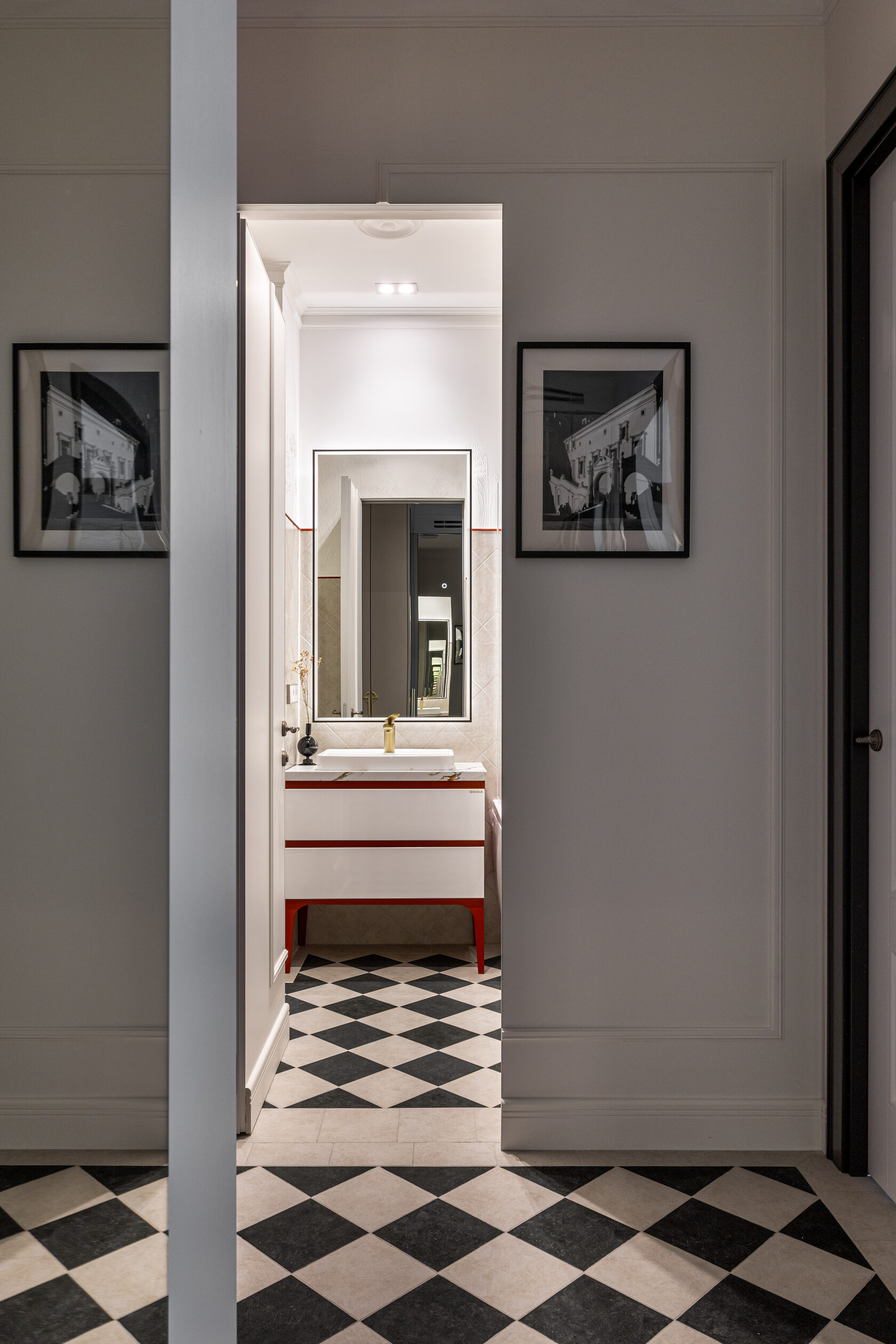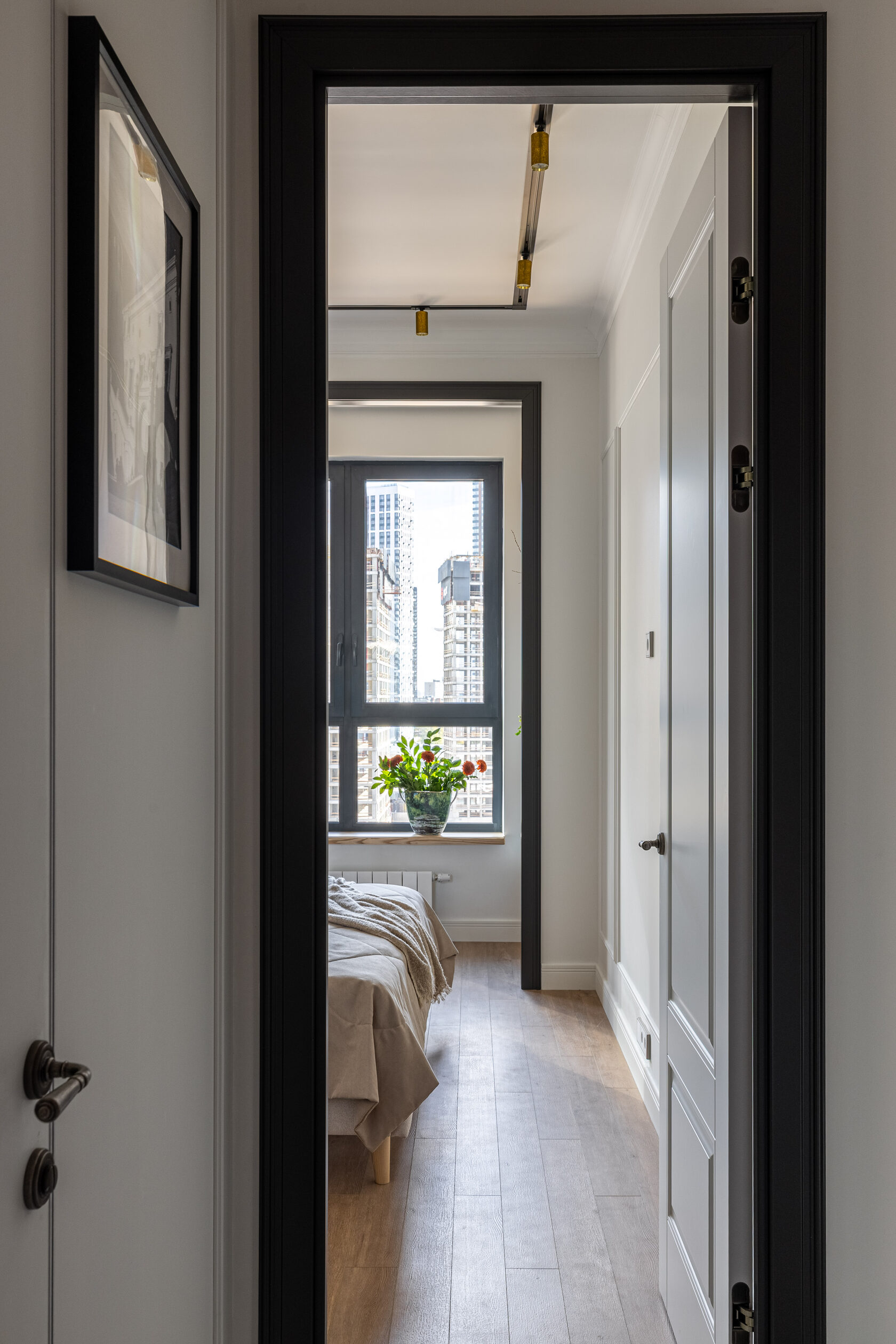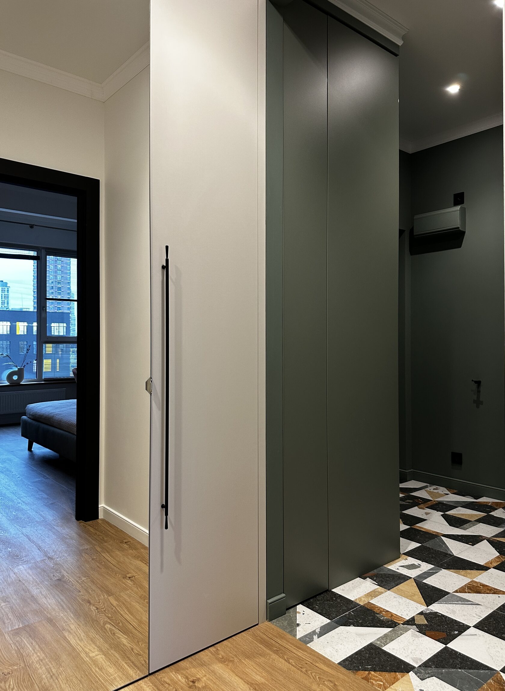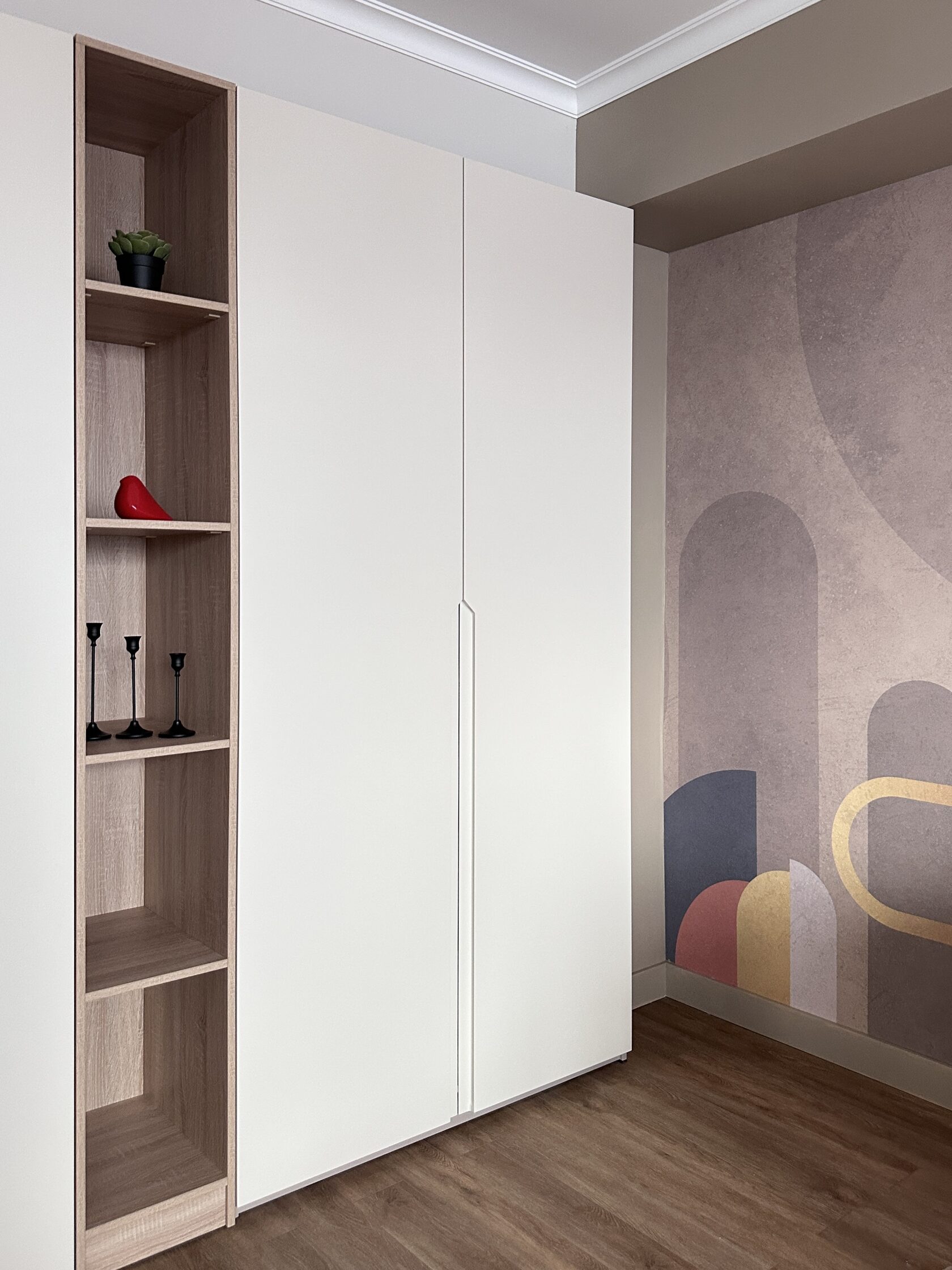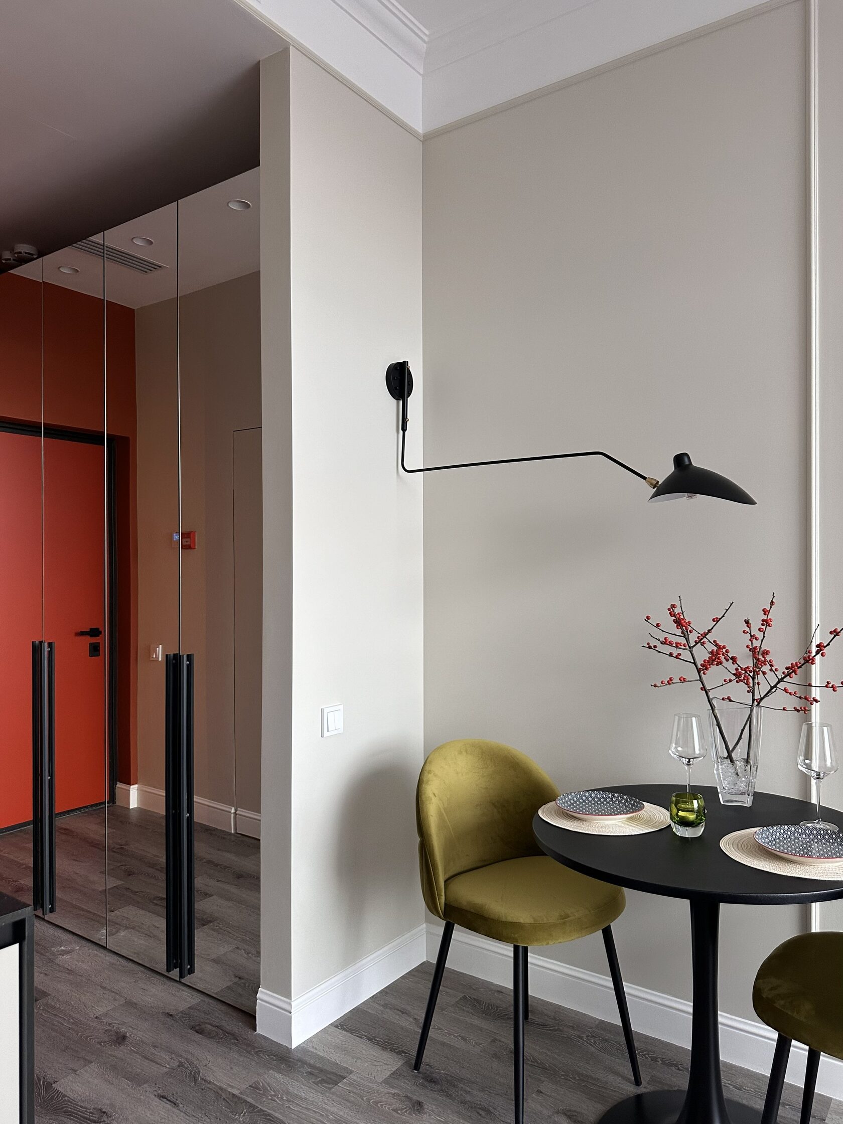 Квартира расположена в старой части Москвы в здании 1913 года, в квартире много окон, что дает дополнительный свет, но также и дополнительные ограничения по расположению стен для выделения комнат. Квартира делится на 3 зоны - общественная, зона для сына-подростка с своим санузлом и приватная зона для хозяйки - спальня, мастер-ванная, гардероб и кабинет.