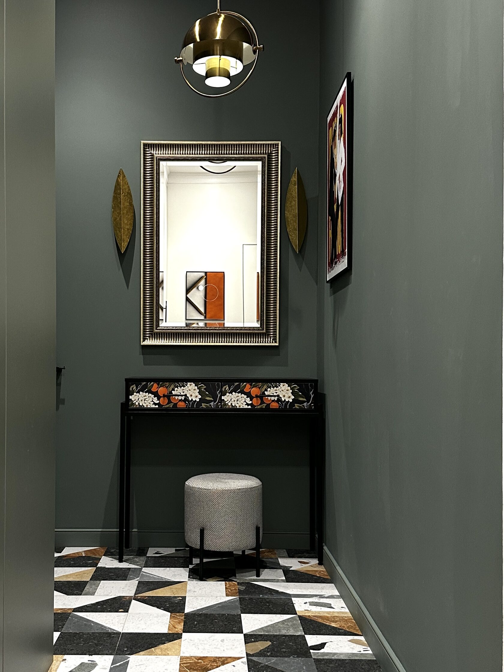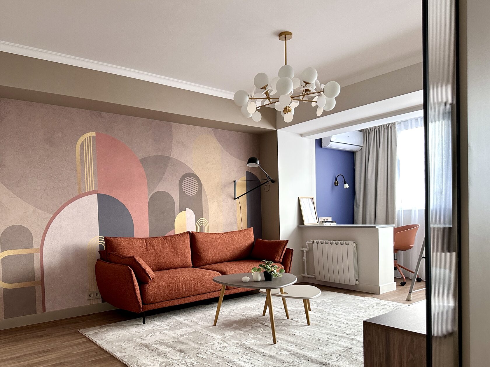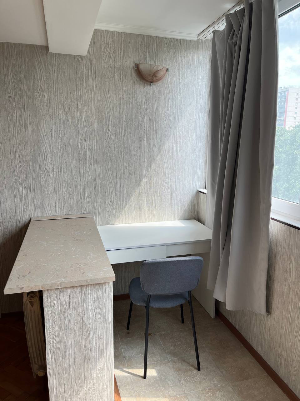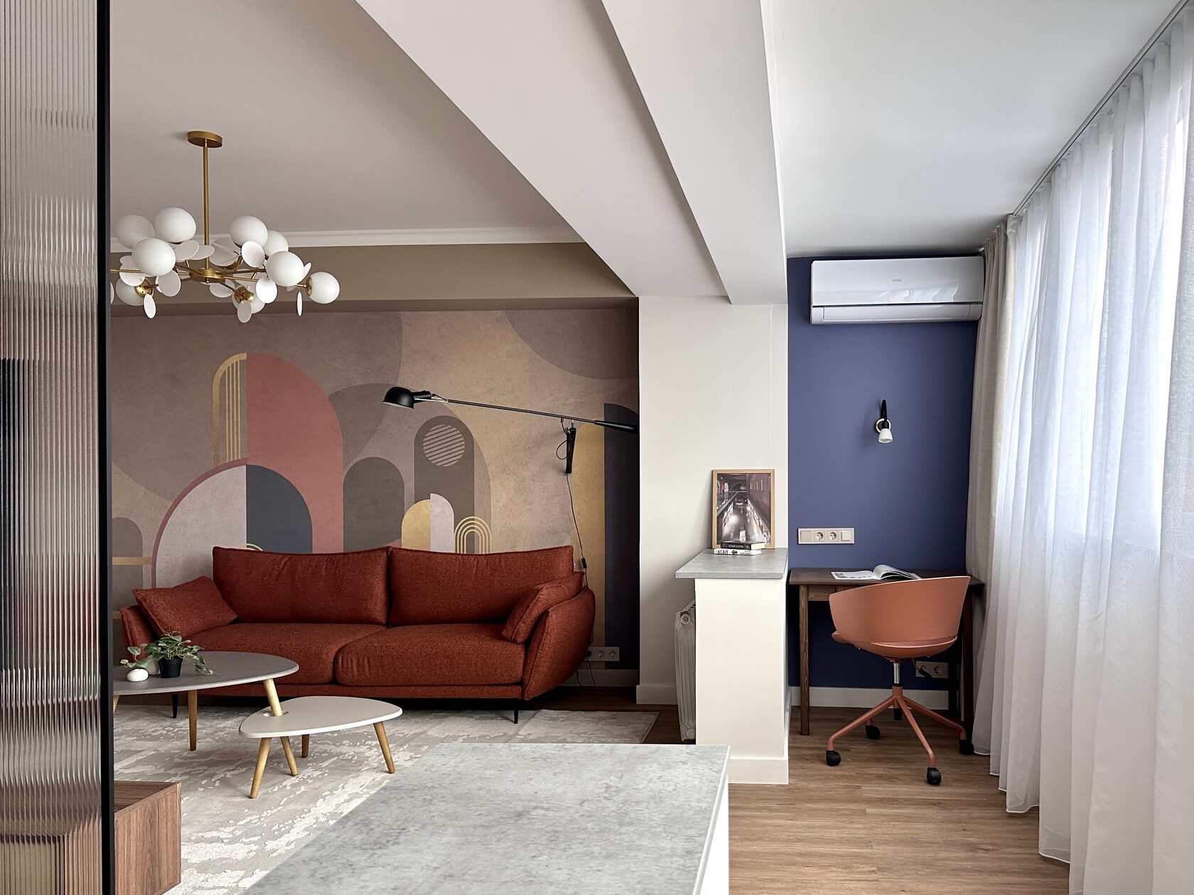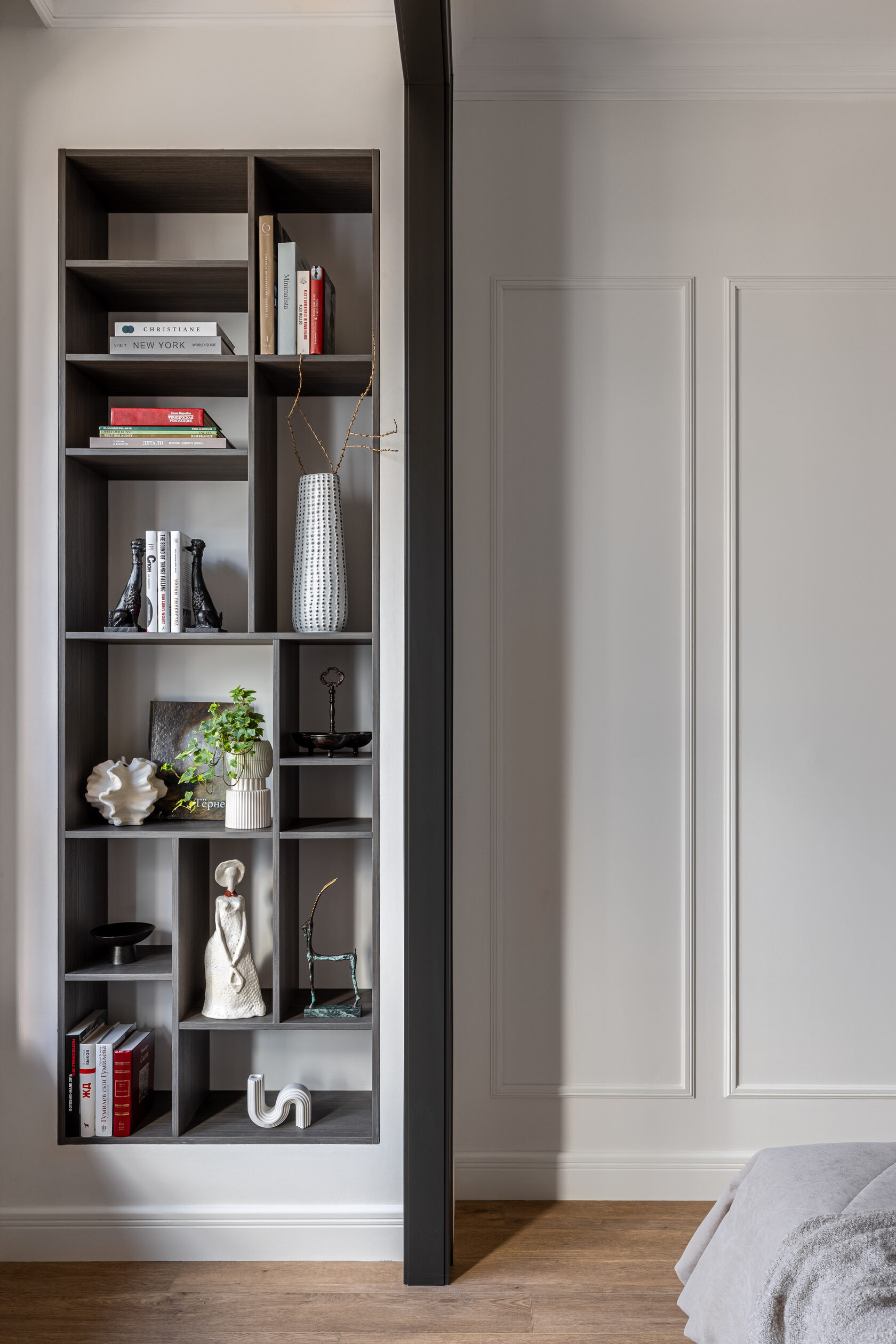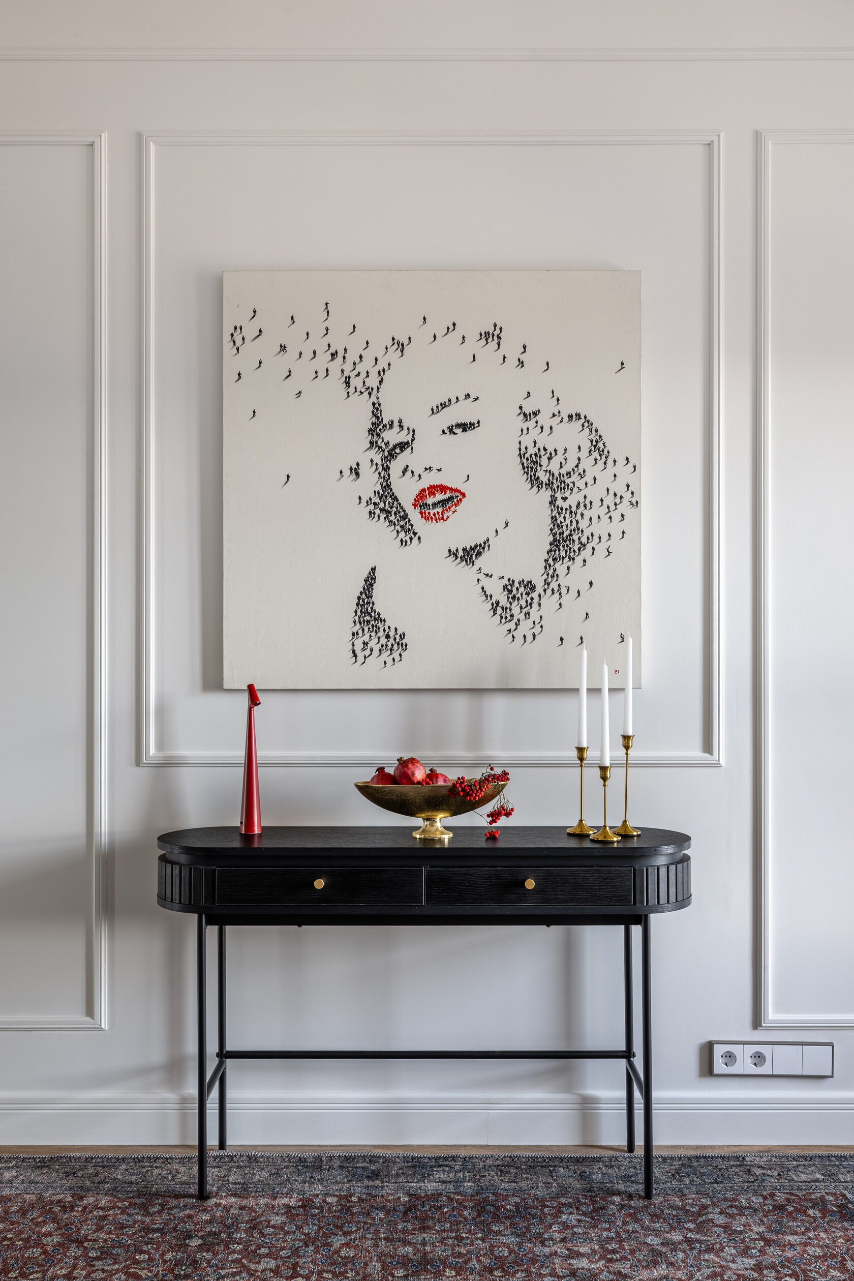 Квартира расположена в старой части Москвы в здании 1913 года, в квартире много окон, что дает дополнительный свет, но также и дополнительные ограничения по расположению стен для выделения комнат. Квартира делится на 3 зоны - общественная, зона для сына-подростка с своим санузлом и приватная зона для хозяйки - спальня, мастер-ванная, гардероб и кабинет.