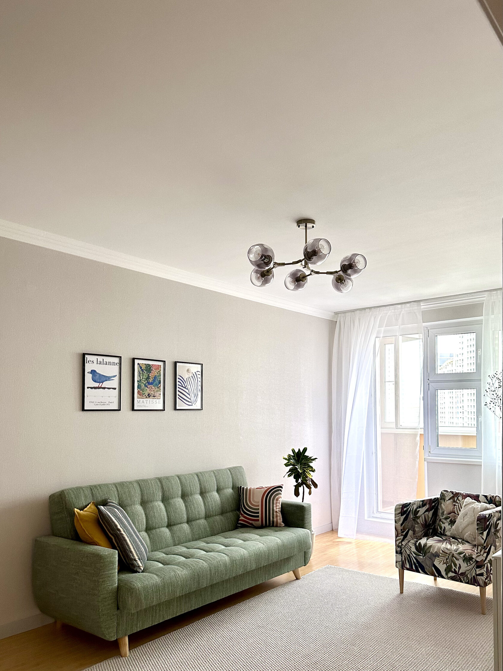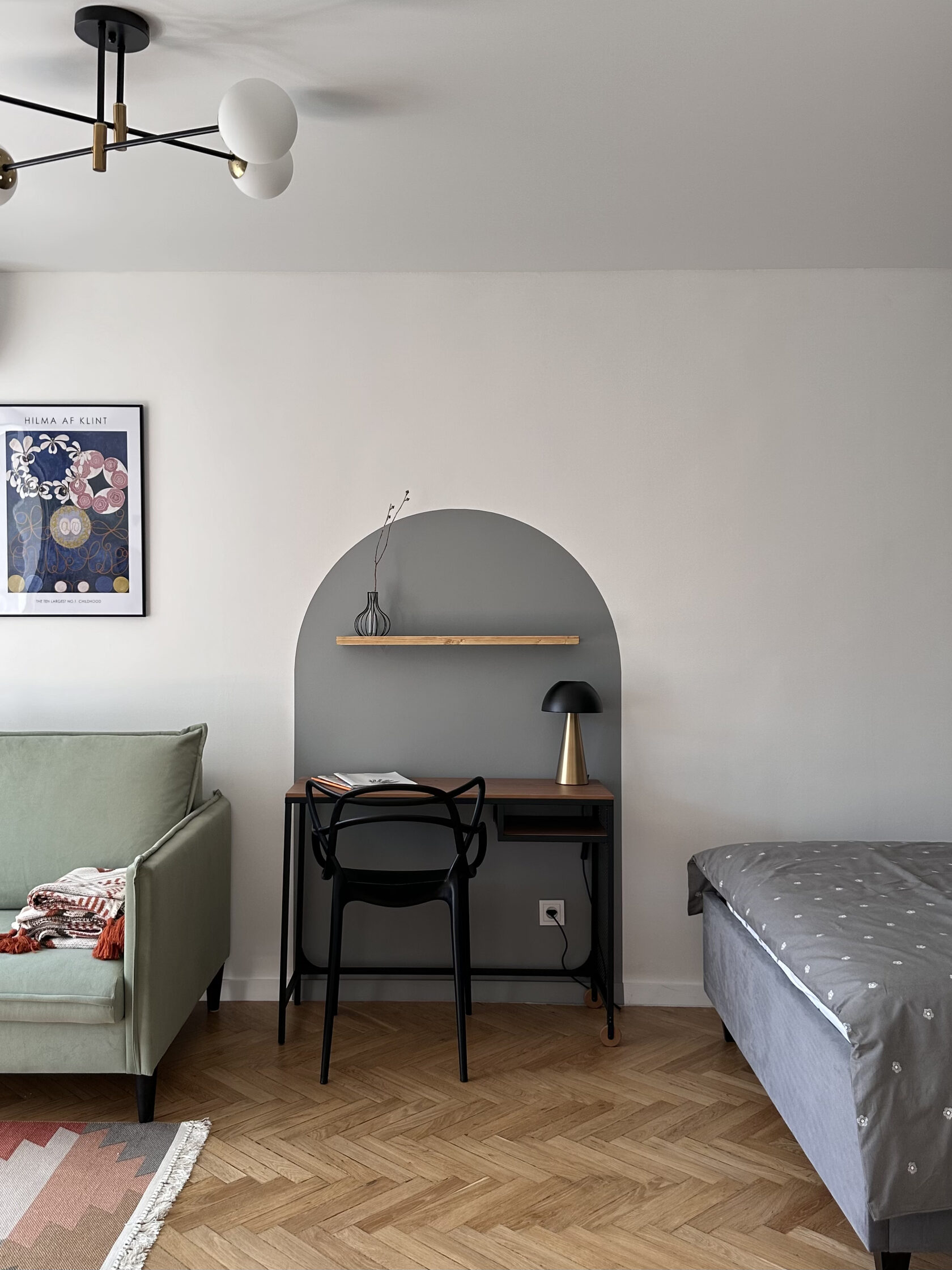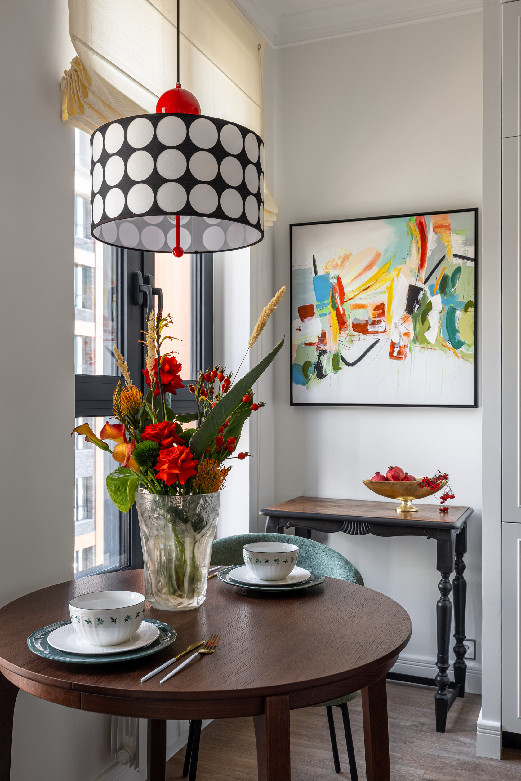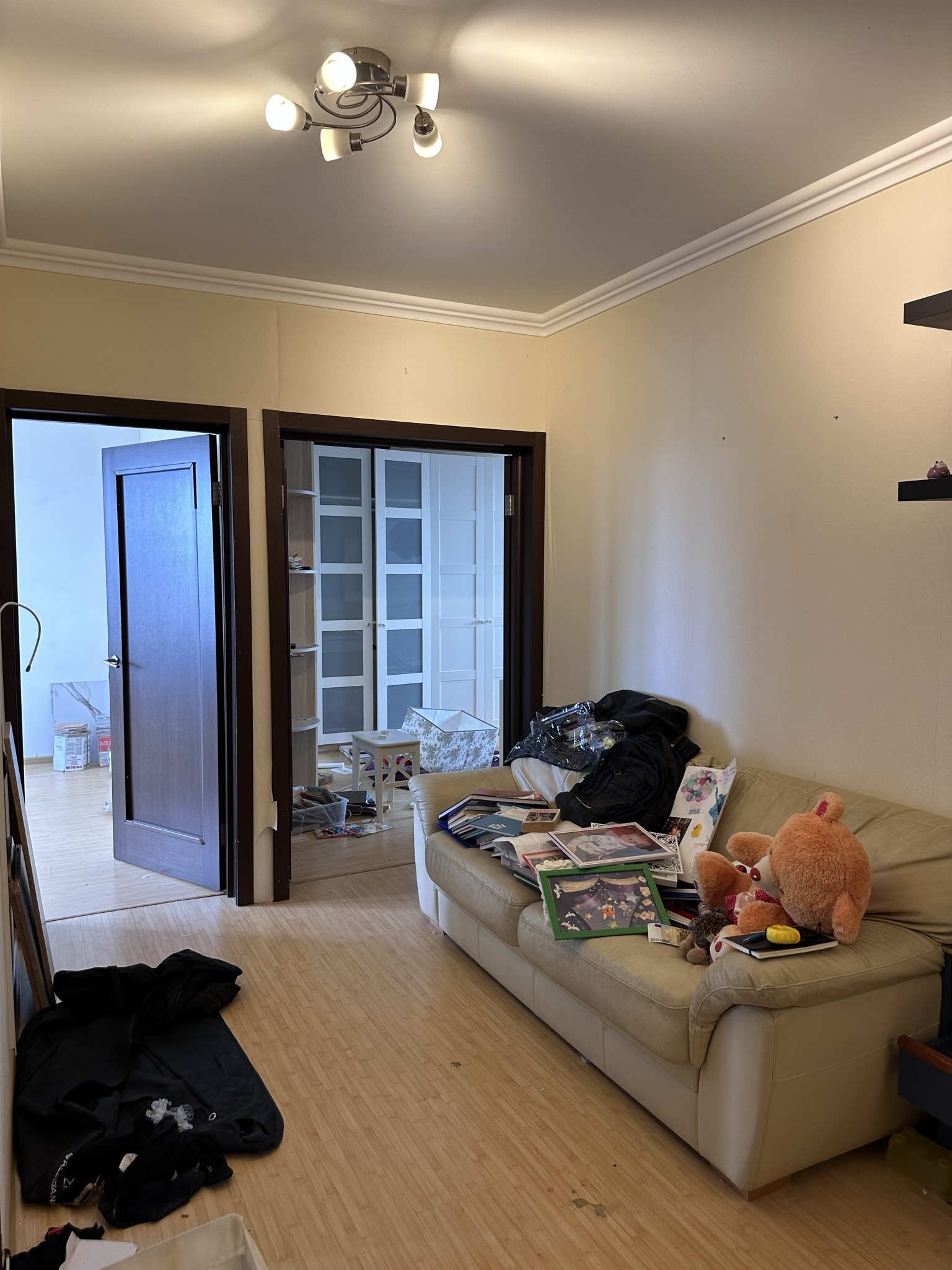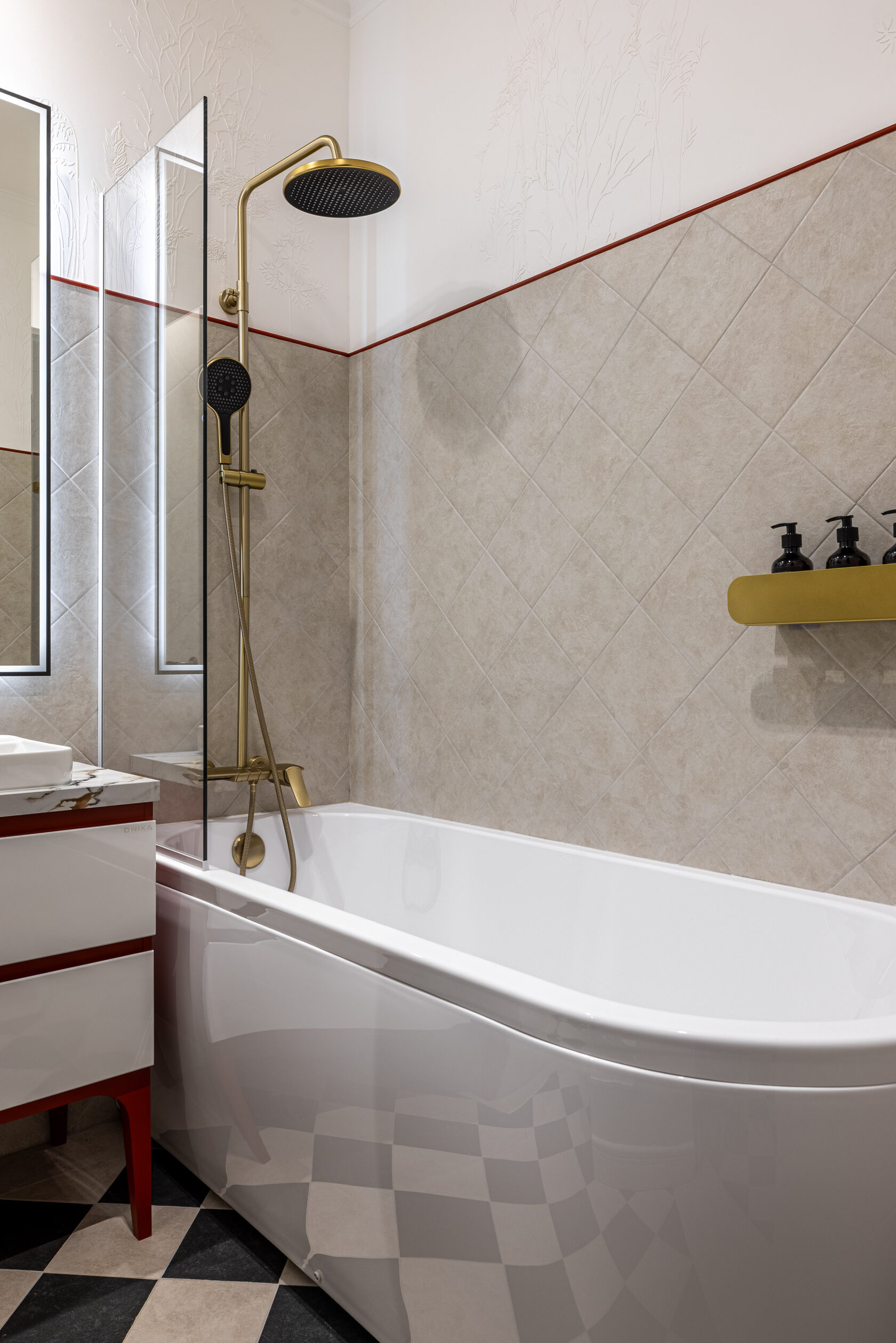 Квартира расположена в старой части Москвы в здании 1913 года, в квартире много окон, что дает дополнительный свет, но также и дополнительные ограничения по расположению стен для выделения комнат. Квартира делится на 3 зоны - общественная, зона для сына-подростка с своим санузлом и приватная зона для хозяйки - спальня, мастер-ванная, гардероб и кабинет.