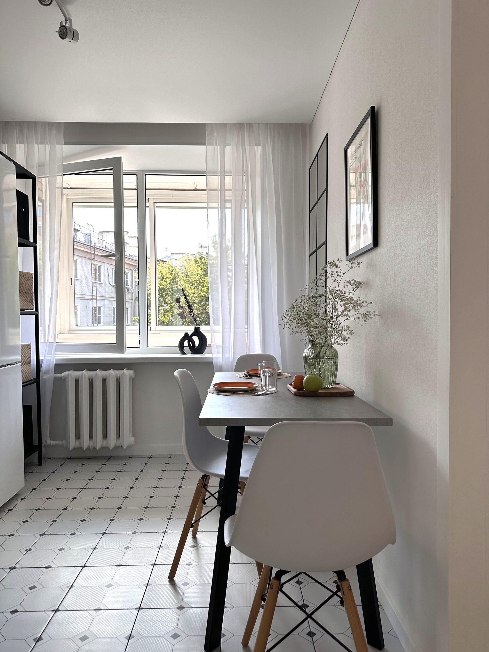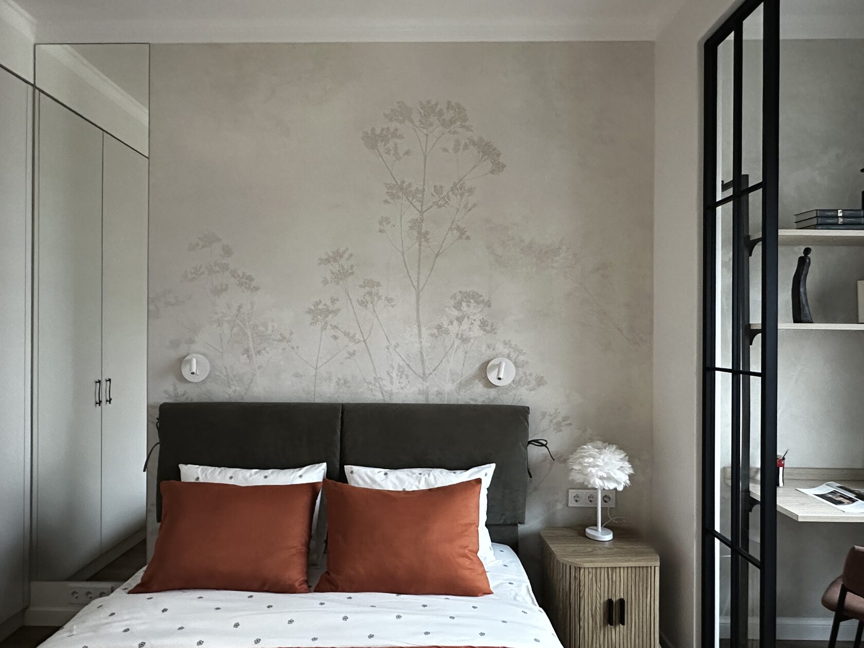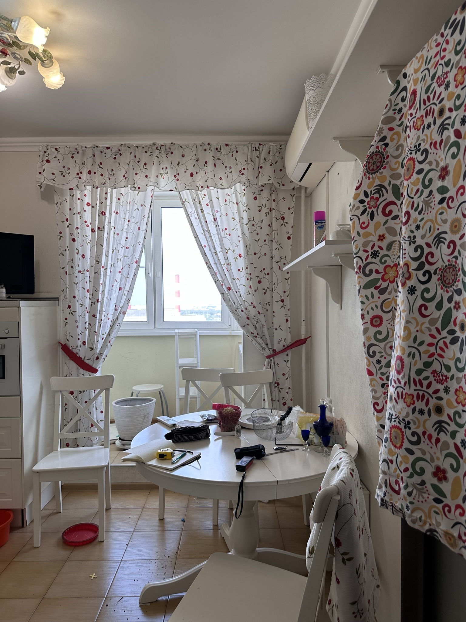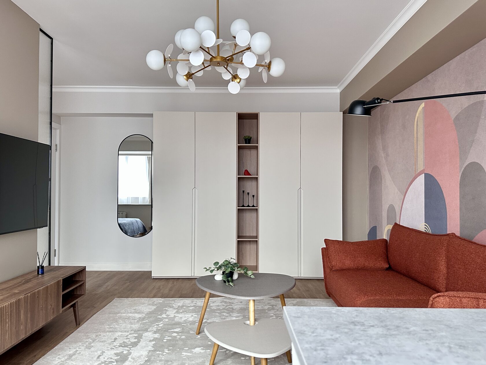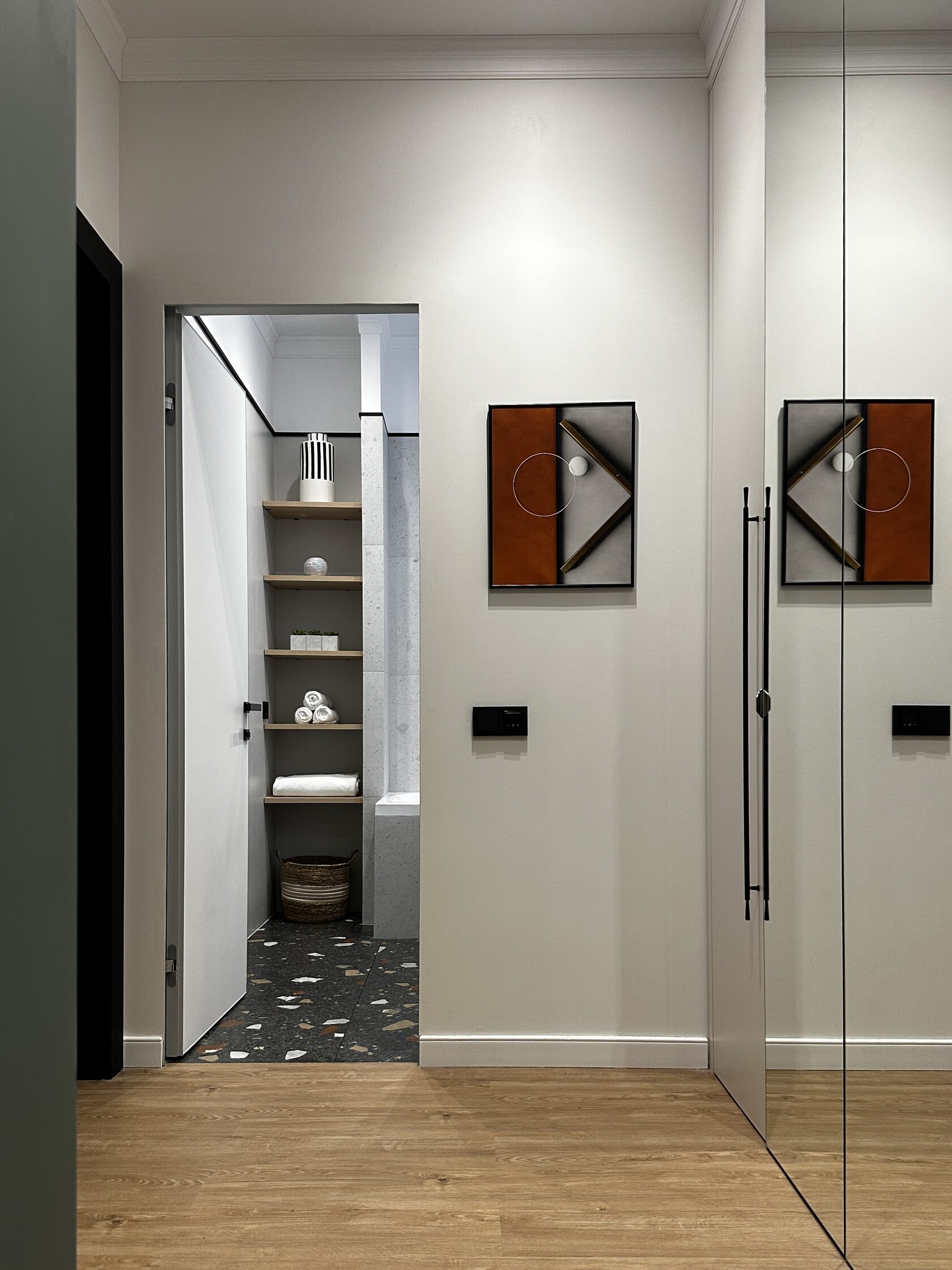 Квартира расположена в старой части Москвы в здании 1913 года, в квартире много окон, что дает дополнительный свет, но также и дополнительные ограничения по расположению стен для выделения комнат. Квартира делится на 3 зоны - общественная, зона для сына-подростка с своим санузлом и приватная зона для хозяйки - спальня, мастер-ванная, гардероб и кабинет.