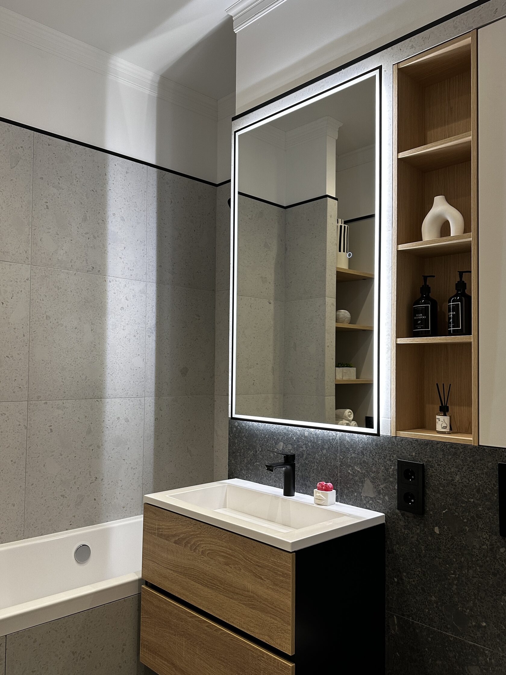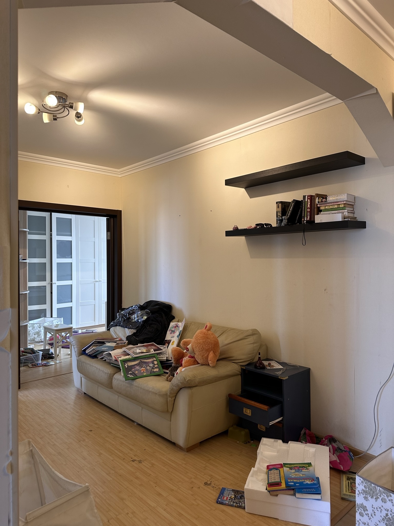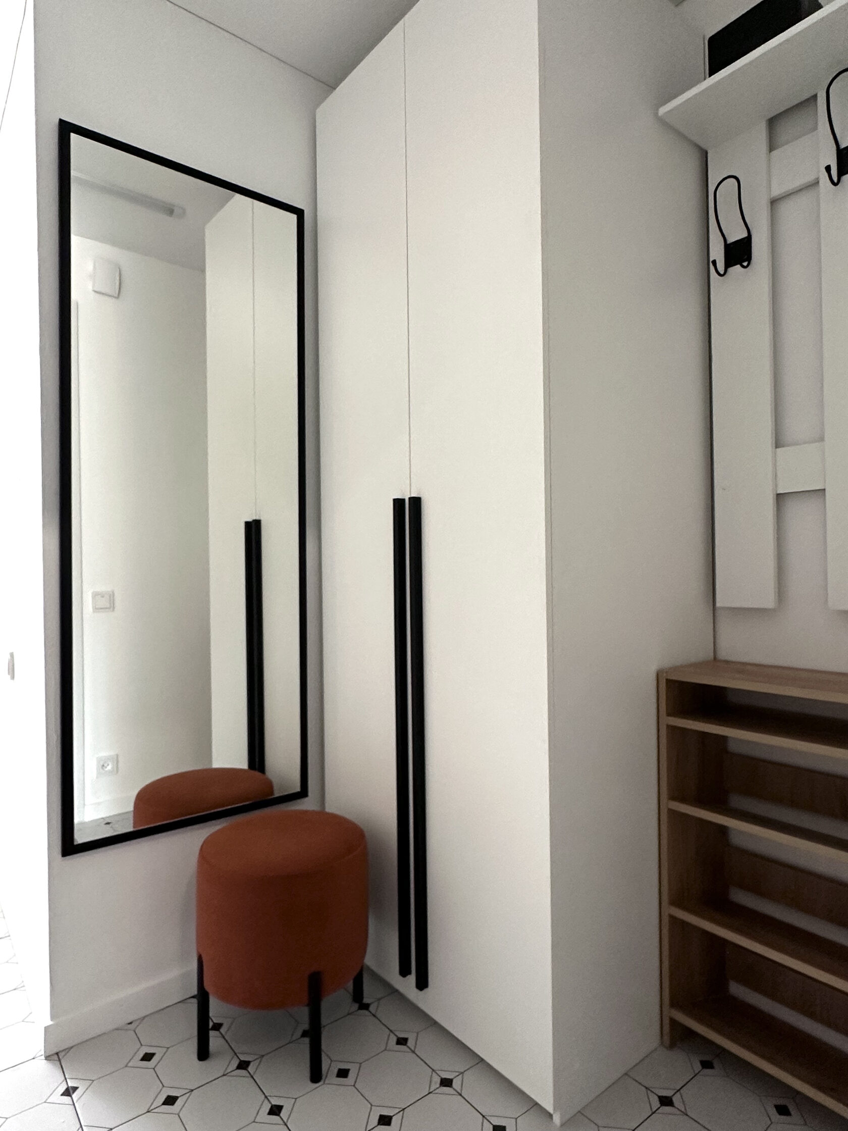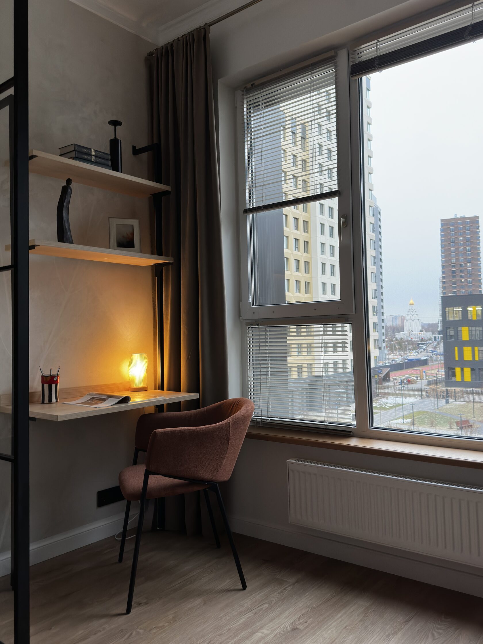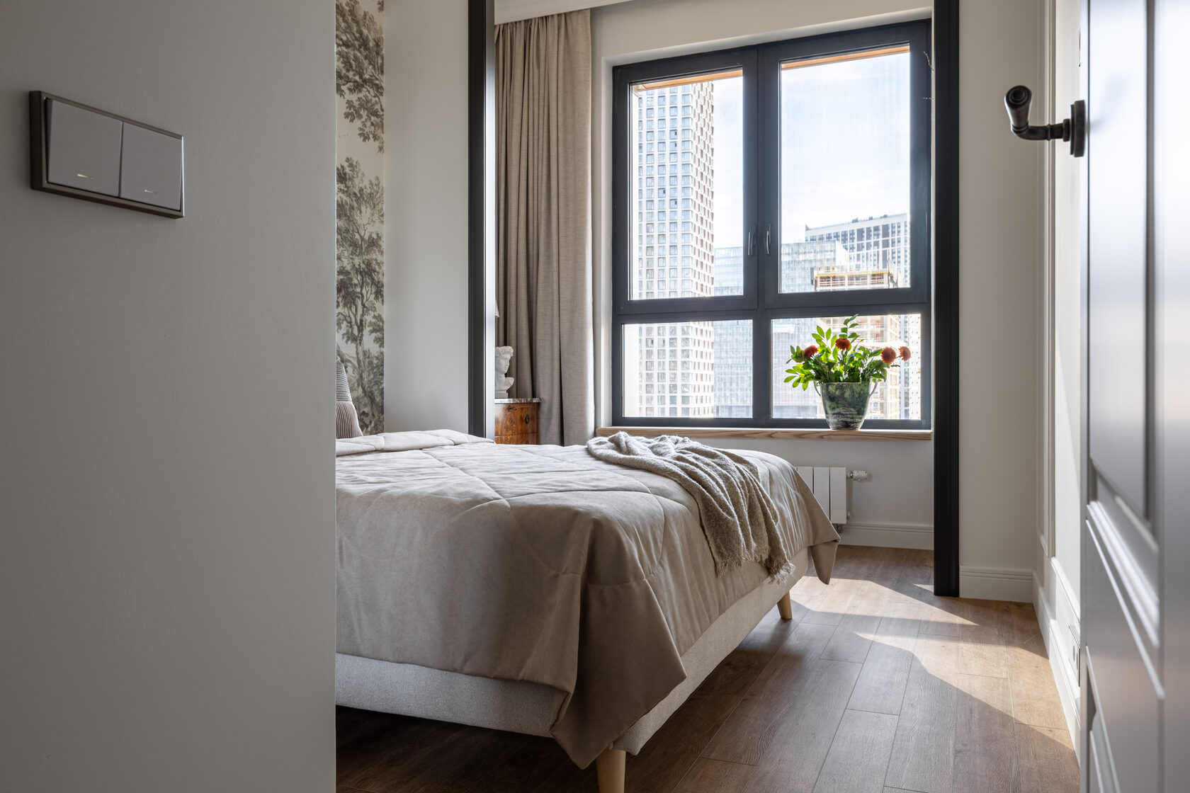 Квартира расположена в старой части Москвы в здании 1913 года, в квартире много окон, что дает дополнительный свет, но также и дополнительные ограничения по расположению стен для выделения комнат. Квартира делится на 3 зоны - общественная, зона для сына-подростка с своим санузлом и приватная зона для хозяйки - спальня, мастер-ванная, гардероб и кабинет.