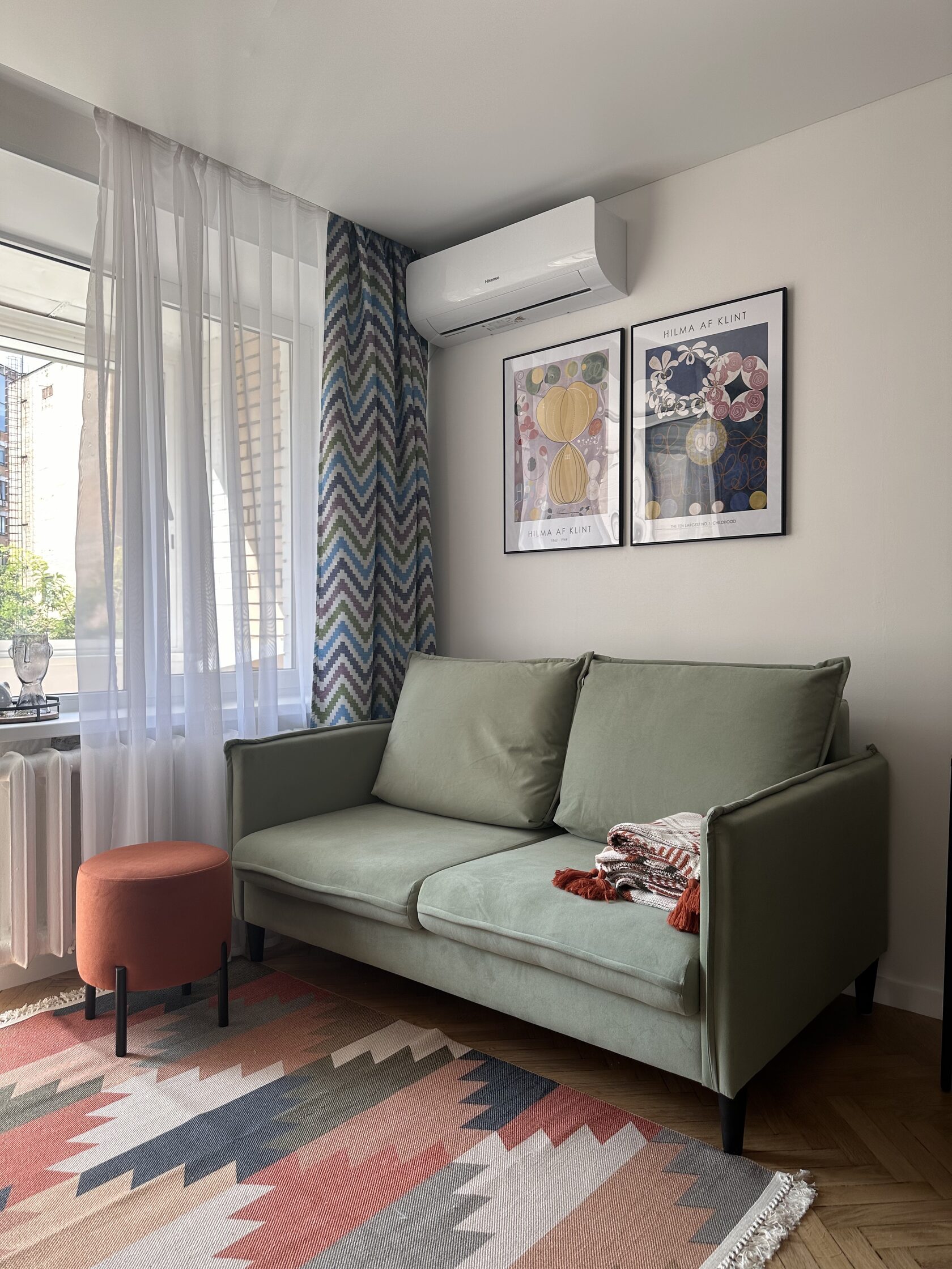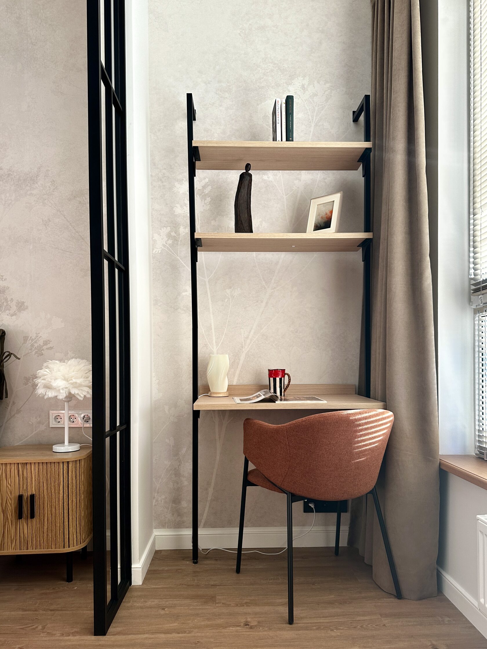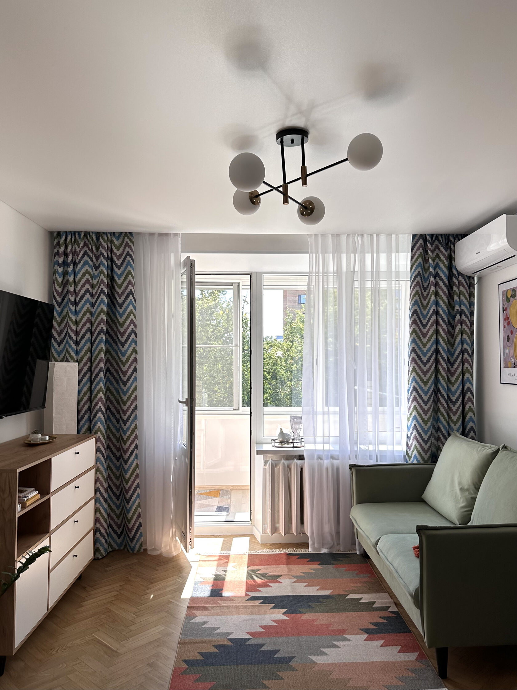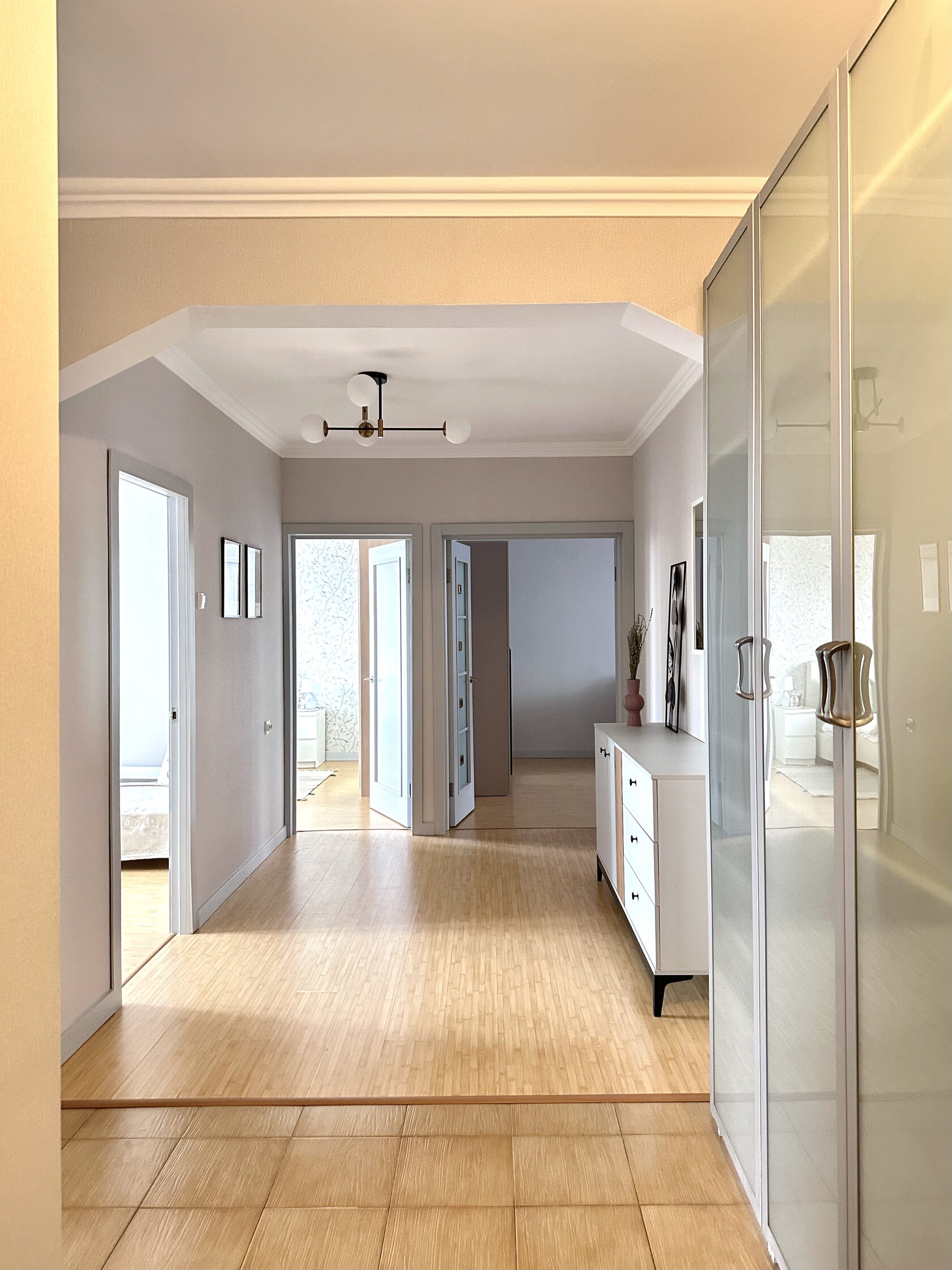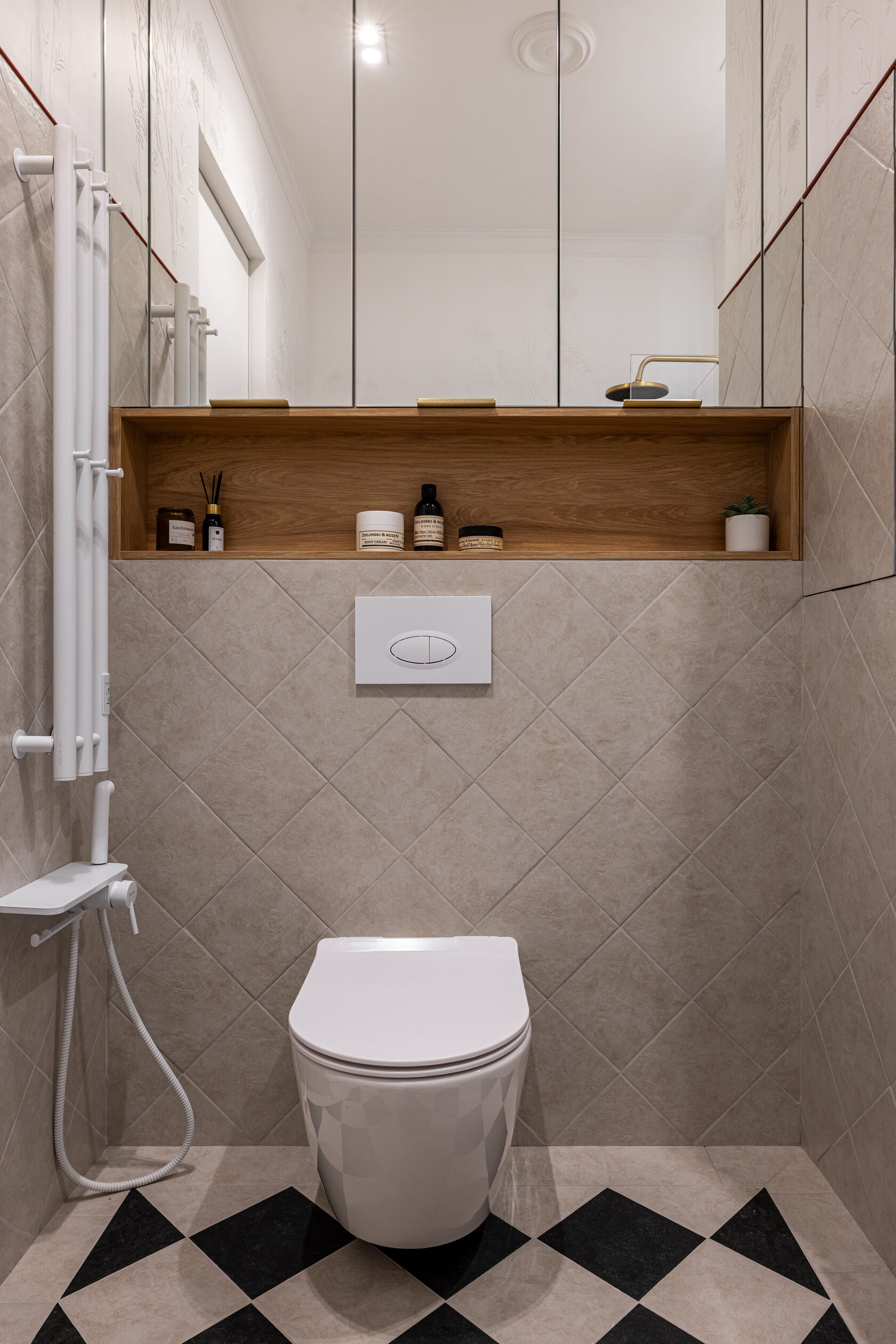 Квартира расположена в старой части Москвы в здании 1913 года, в квартире много окон, что дает дополнительный свет, но также и дополнительные ограничения по расположению стен для выделения комнат. Квартира делится на 3 зоны - общественная, зона для сына-подростка с своим санузлом и приватная зона для хозяйки - спальня, мастер-ванная, гардероб и кабинет.