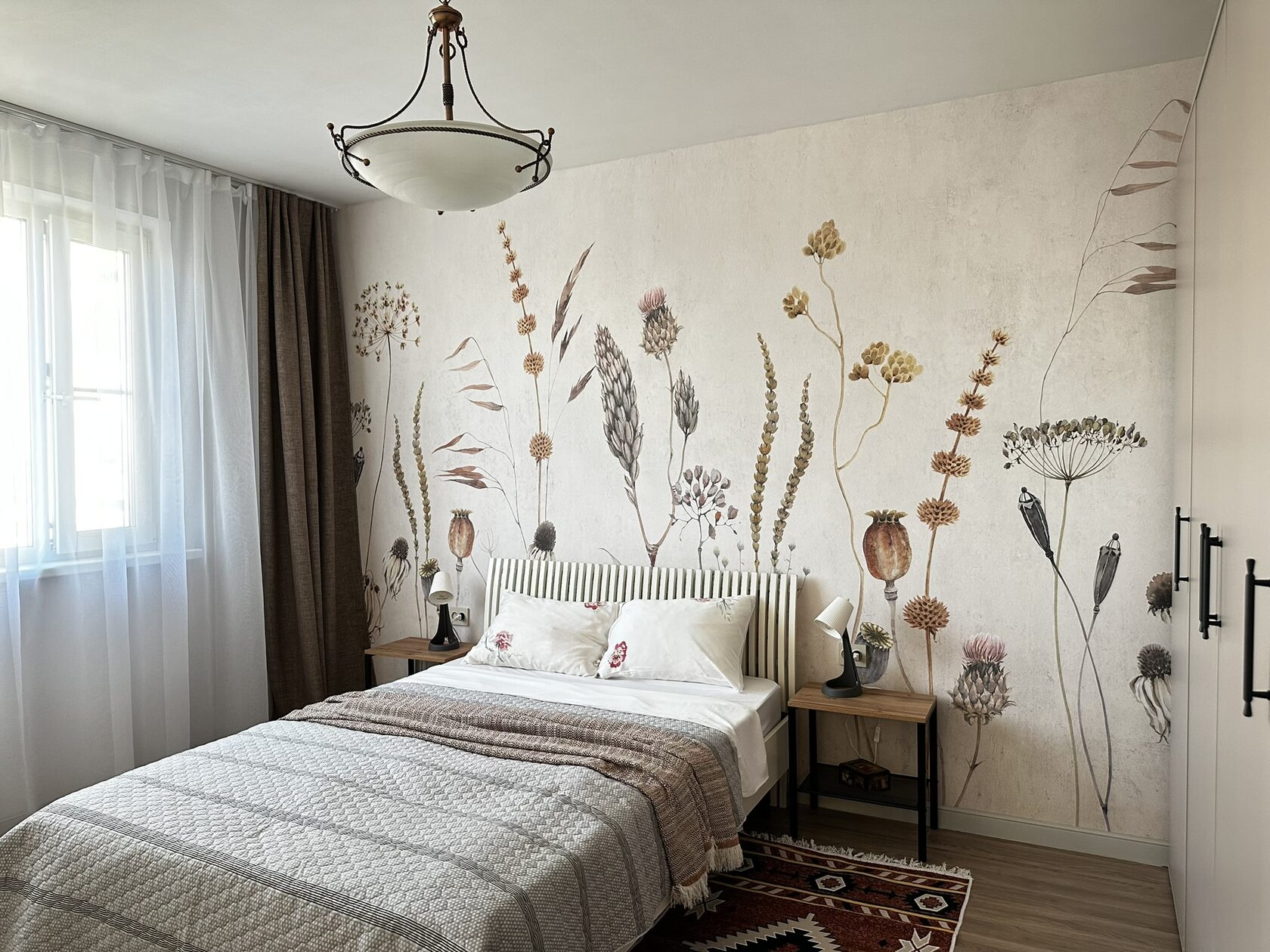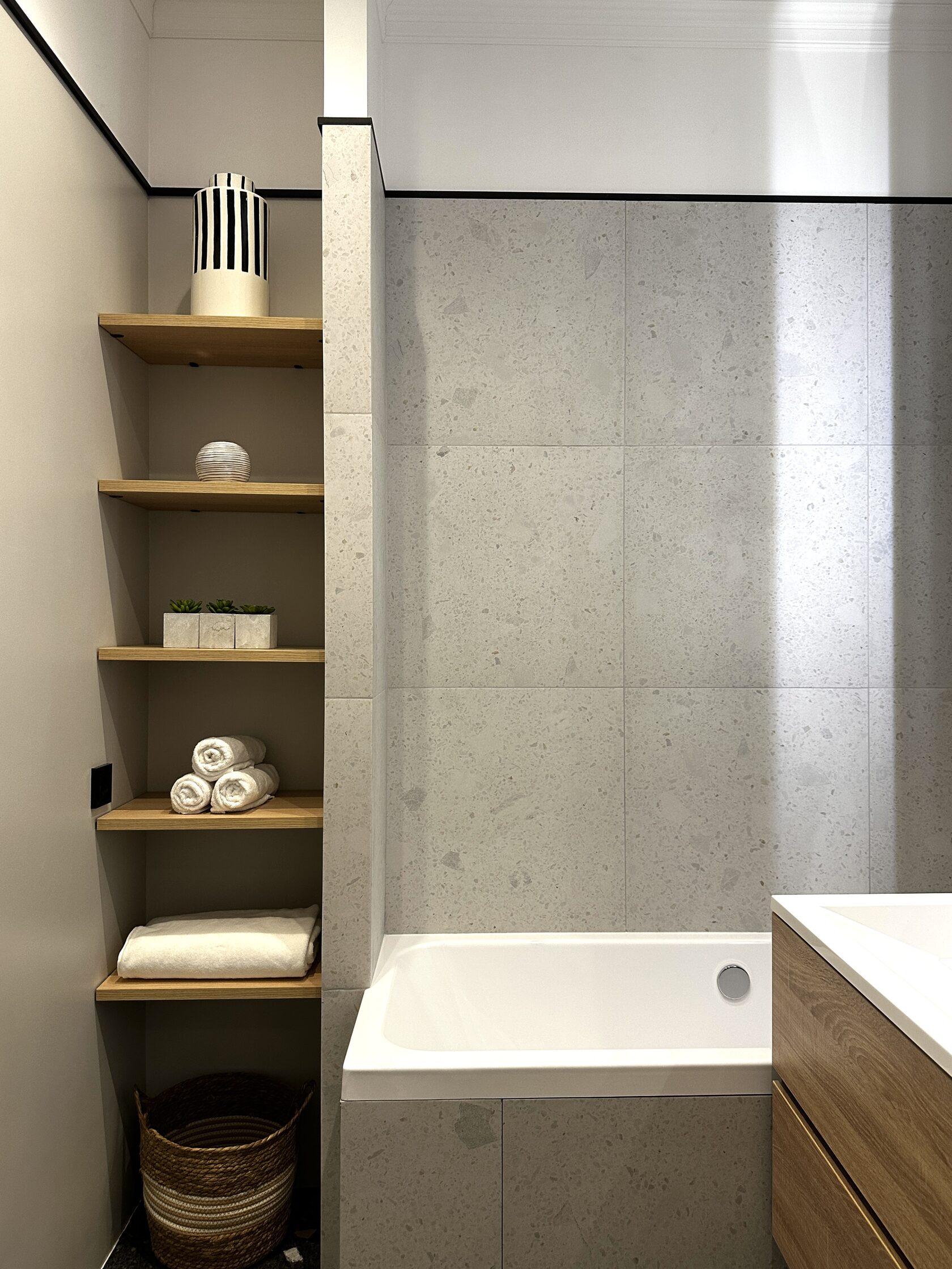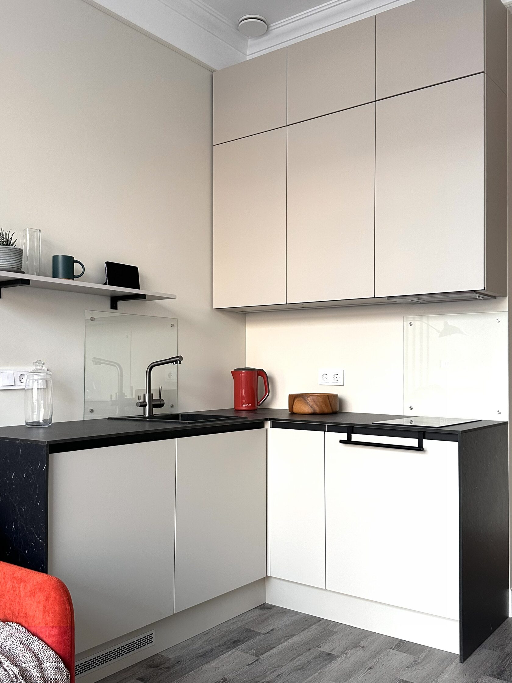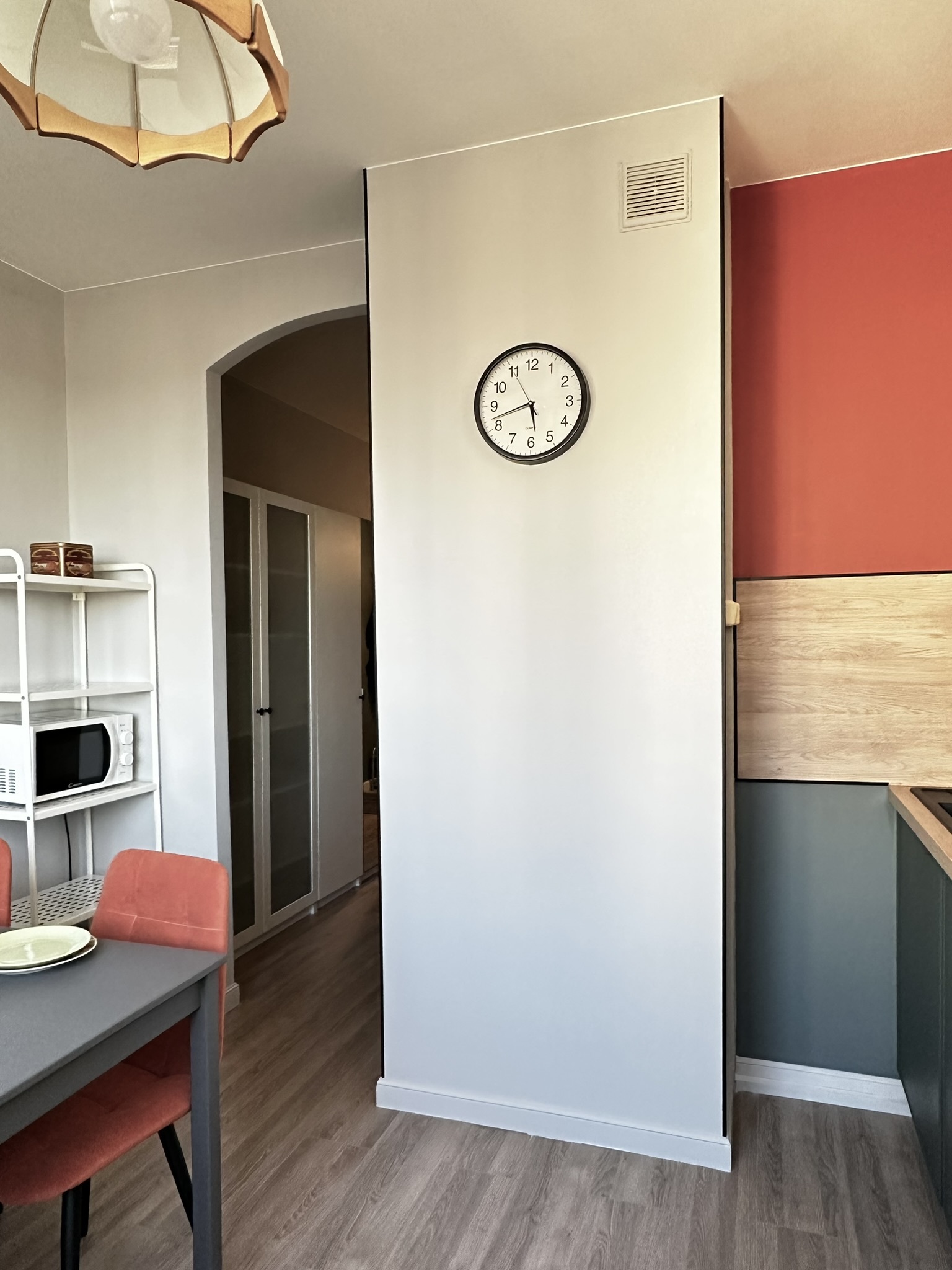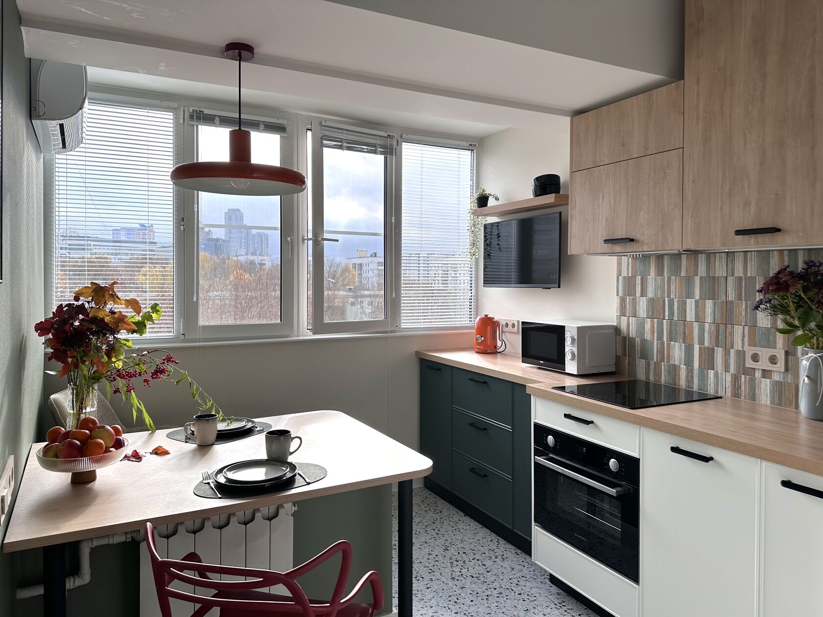 Квартира расположена в старой части Москвы в здании 1913 года, в квартире много окон, что дает дополнительный свет, но также и дополнительные ограничения по расположению стен для выделения комнат. Квартира делится на 3 зоны - общественная, зона для сына-подростка с своим санузлом и приватная зона для хозяйки - спальня, мастер-ванная, гардероб и кабинет.